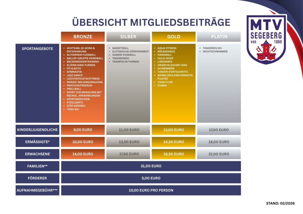 *** Bei der Aufnahme in den MTV Segeberg wird die Aufnahmegebühr in Höhe von 10,00 € pro Person fällig. Die Aufnahmegebühr wird mit dem ersten Beitrag fällig.